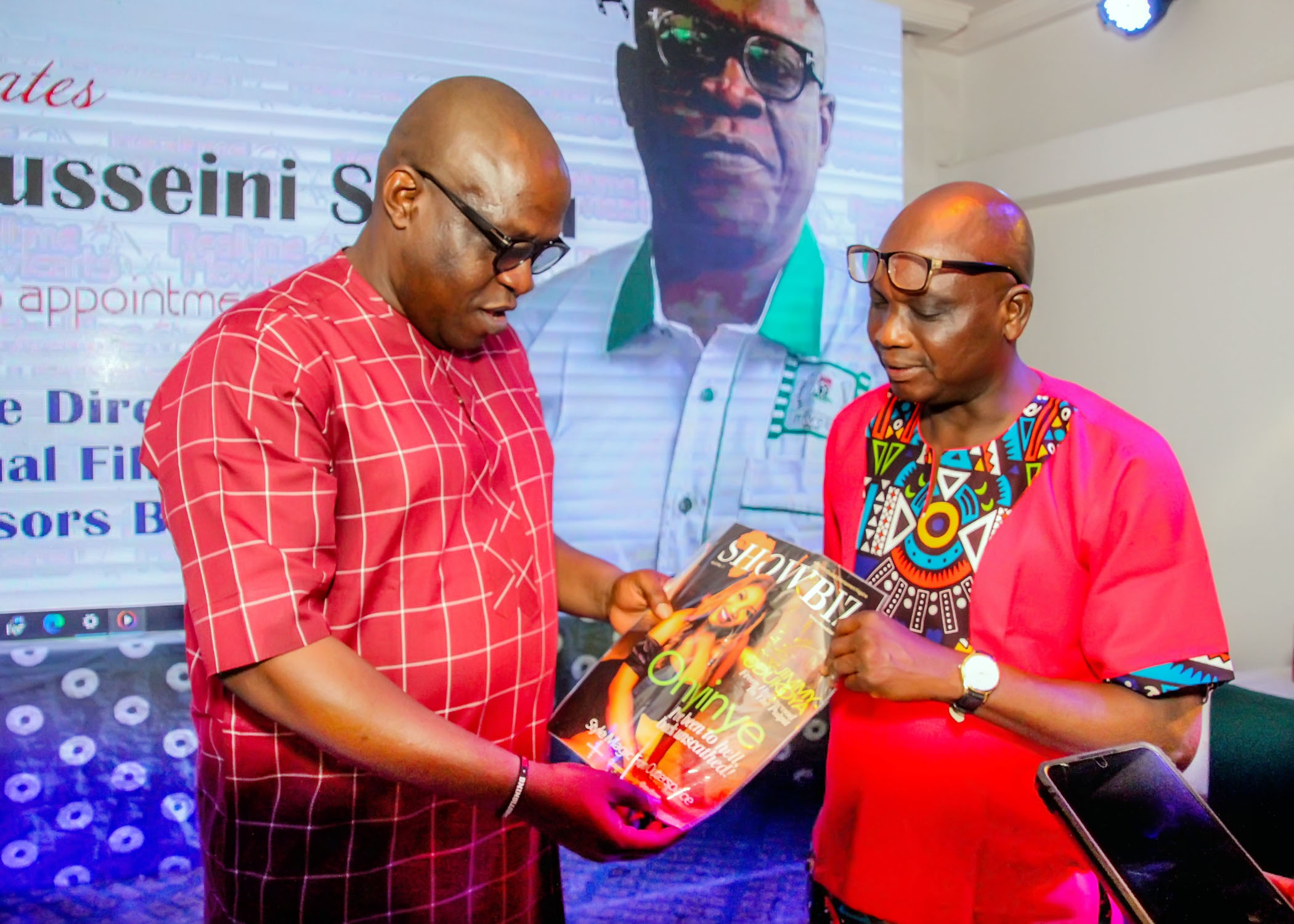 Publisher/Executive Editor, SHOWBIZ, Tosin Ajirire presenting a copy of the magazine to the NFVCB boss, Shaibu Husseini
